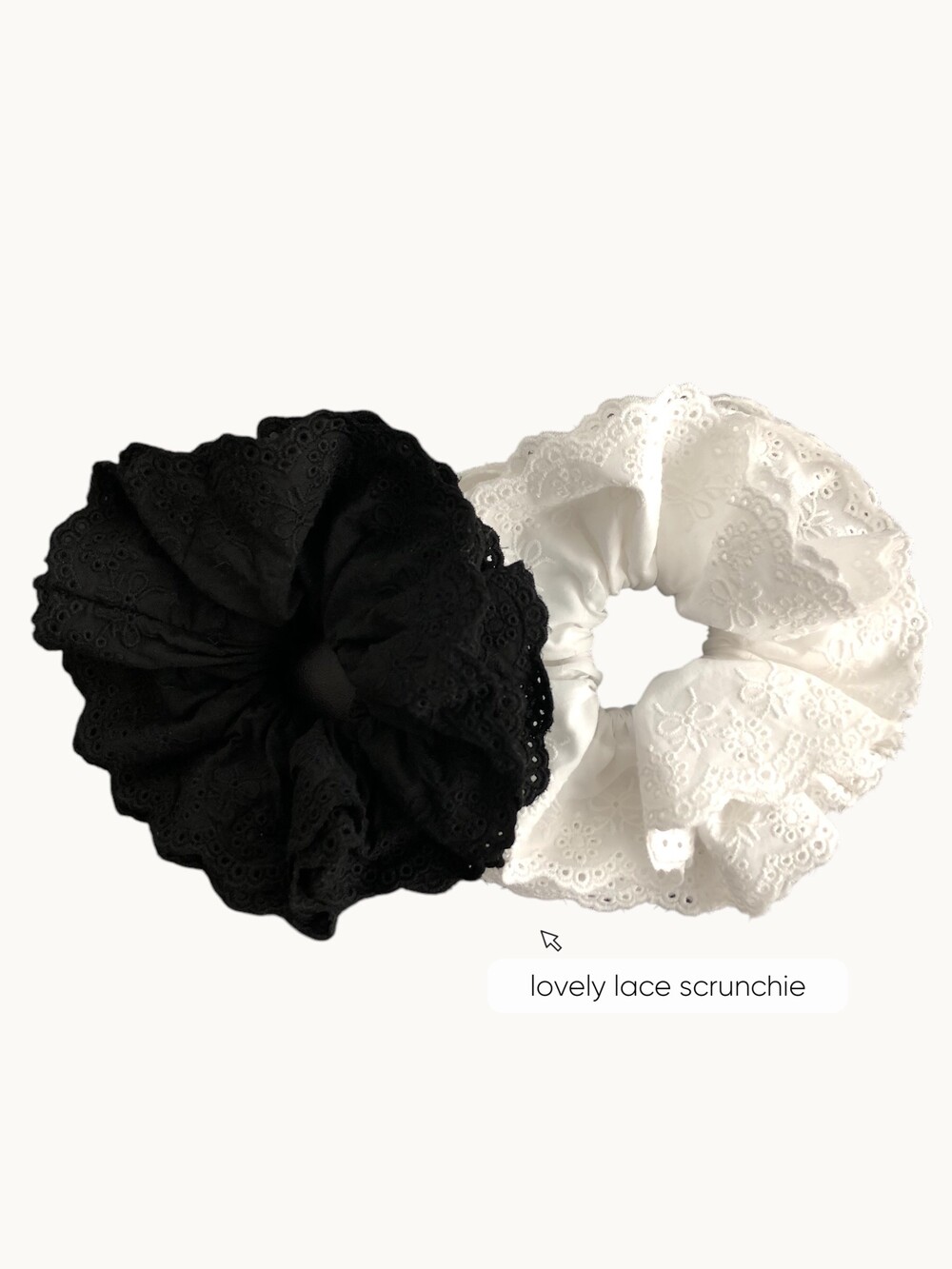 사랑스러운 레이스 원단으로 제작된 헤어 스크런치입니다.